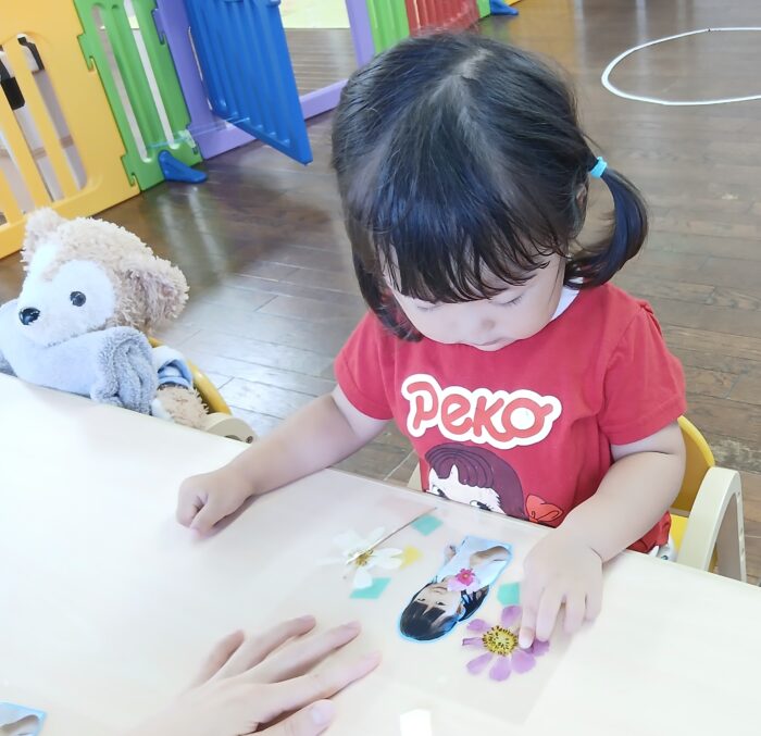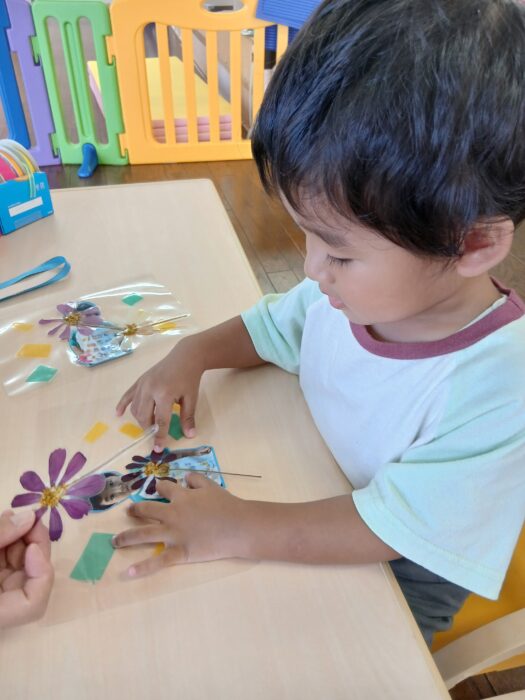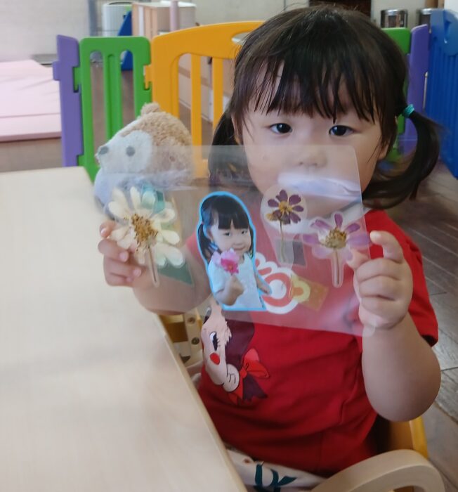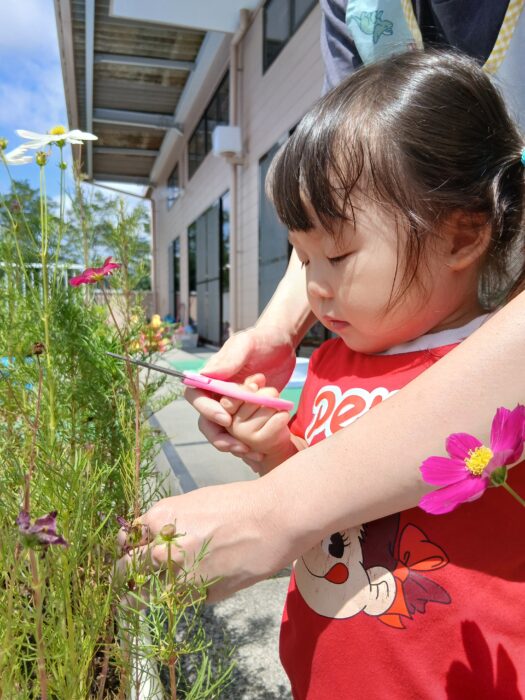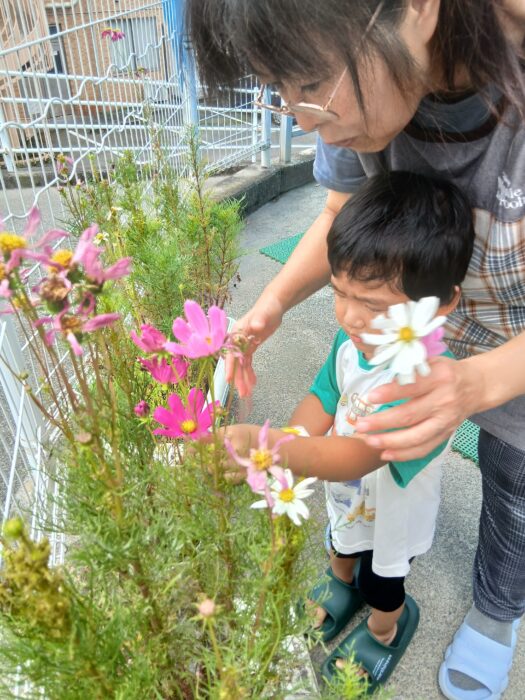 種から育てたコスモスが7月に咲き始め、9月にはいくつも咲きました。そのコスモスを摘んで、敬老の日のプレゼント作りをしました。「きれいね。」とうれしそうな表情で、かわいいプレゼントができました。