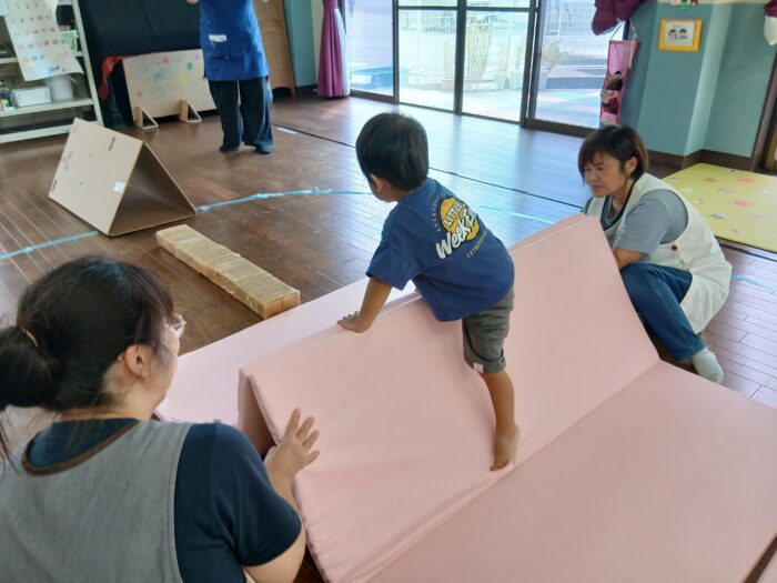 運動会を開催しました。体操・サーキット・ボール運び・徒競走・リレーと盛りだくさん。先生の話を真剣に聞いて、張り切って挑戦する姿に成長を感じました。リレーは「もう一回やりたい」の声があがり、子どものみで走ってバトンの受け渡しをする姿も。徒競走では、一番になりたくて落ち込んで…。計3回走り、全員一度は一番でゴールし大満足でした。