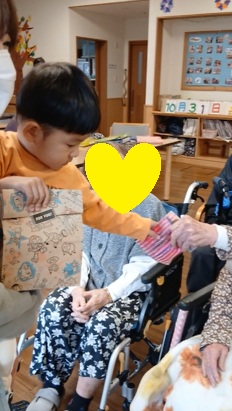 法人職員の方に「かわいい」とたくさん声をかけていただき、お仕事中のお母さんとも会い、お菓子もいただきました。子どもたちはドキドキしていましたが、いただいたお菓子を大切に持ってうれしそうでした。デイサービスの利用者さんとも交流し、約100歳差の方との交流も実現しました。ご協力いただいた職員の方々、ご利用者様、ありがとうございました!