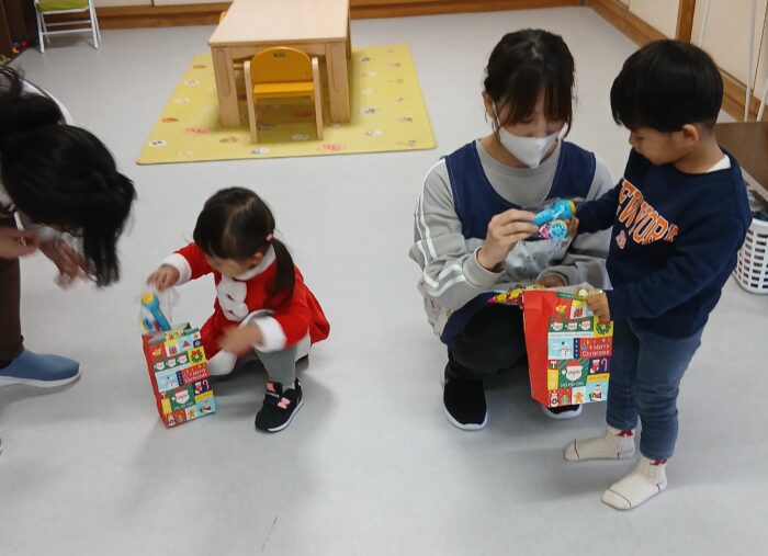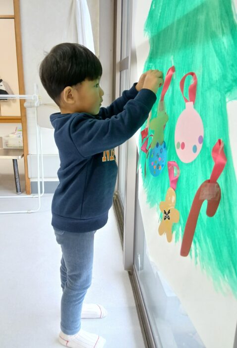 今日はクリスマス会。クリスマスツリーを飾り付けるため、オーナメントを探す宝探しゲームをしました。宝箱を本当に一生懸命探し、「あった!」と元気な声がたくさん聞こえました。ツリーのてっぺんに飾る星はサンタさんが持ってきてくれました。サンタさんと一緒に星を飾り、クリスマスプレゼントももらいました。積極的に握手に行く子も緊張した表情の子もいましたが、楽しいクリスマス会になりました。