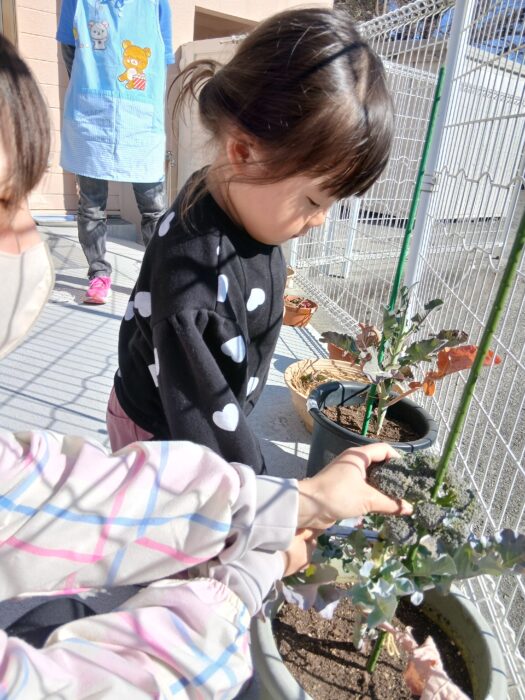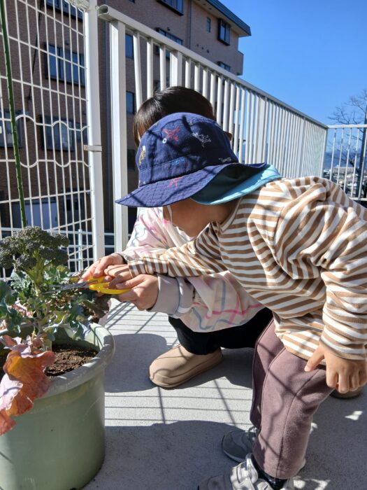 2月4日 ブロッコリー収穫 2026-02-04 10月に植えたブロッコリーを収穫しました。太い茎をみんなで分担しながらハサミでちょっきん!おやつで食べました。ブロッコリーが好きな子はもちろん、お野菜が苦手な子も、自分で採ったブロッコリーは一味違うようで、「おいしい!」と食べる事ができました。